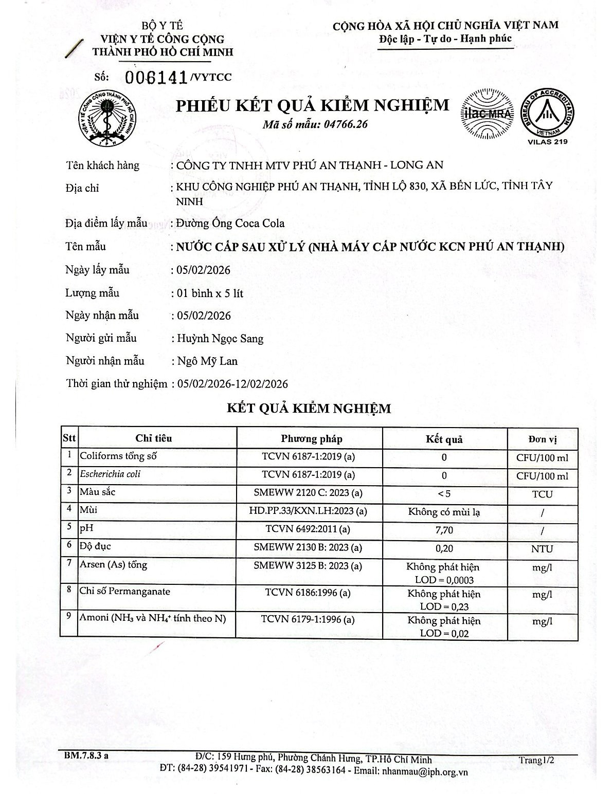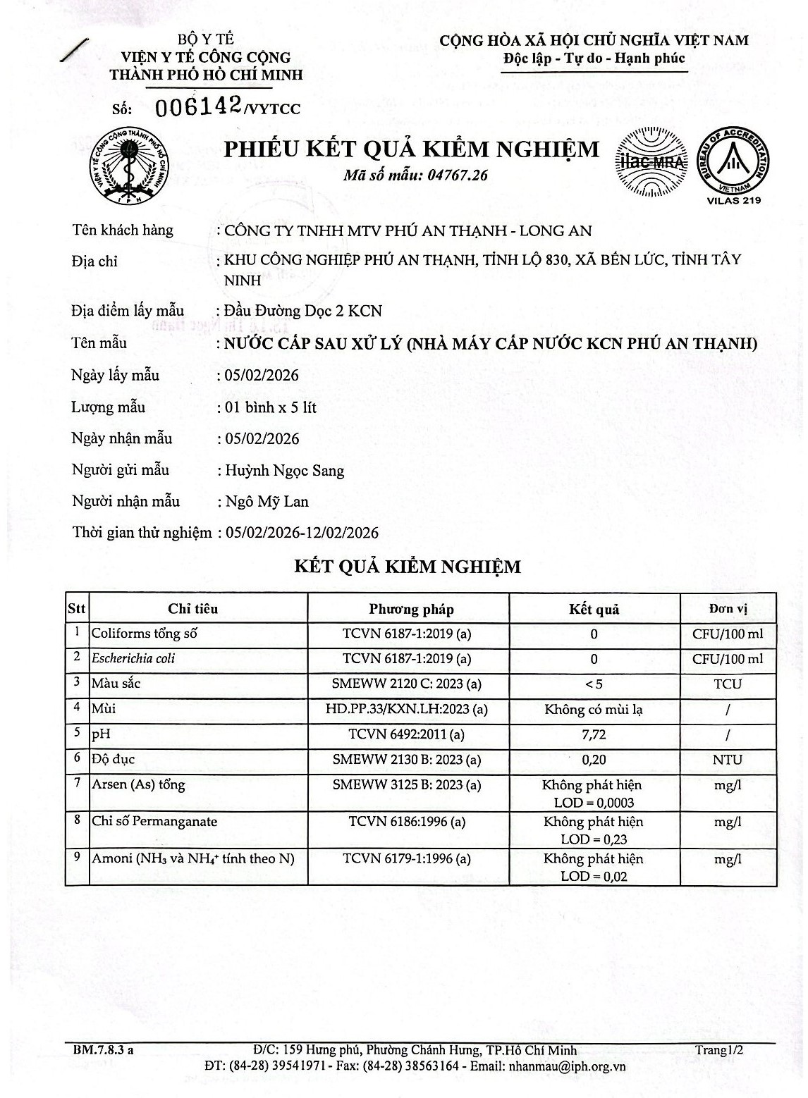 Kết Quả Nước Cấp Sau Xử Lý