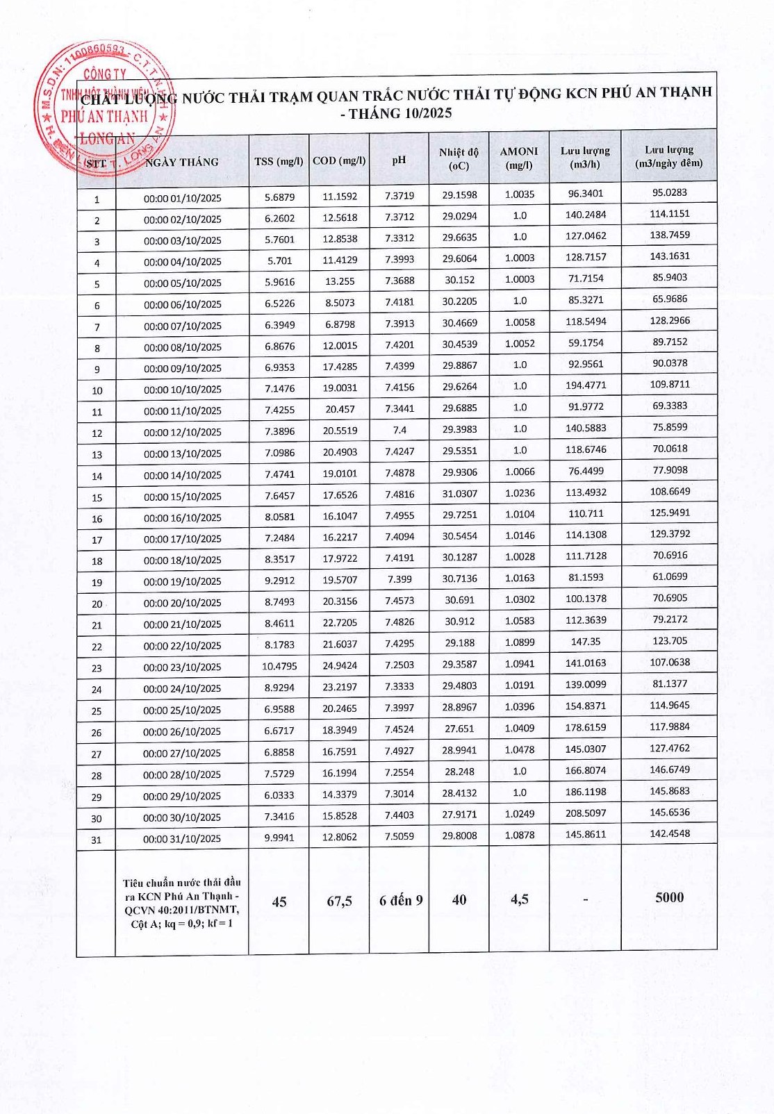 Chất lượng nước thải trạm quan trắc tự động 6 tháng cuối năm 2023